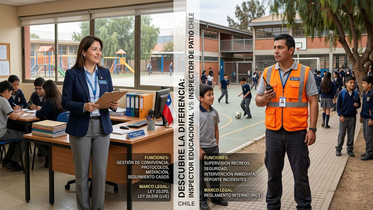 Diferencia entre inspector educacional e inspector de patio en Chile: funciones, marco legal y qué curso elegir según el cargo que buscas.
